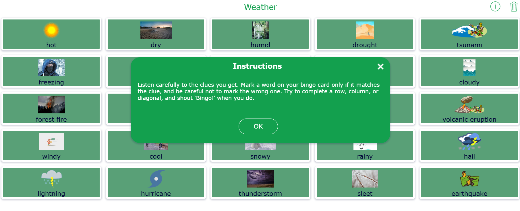 Reinforce vocabulary and terminology with the Bingo game! Every student gets a scrambled bingo card. The teacher reads out the bingo card associations while students tick off the boxes on their bingo cards.